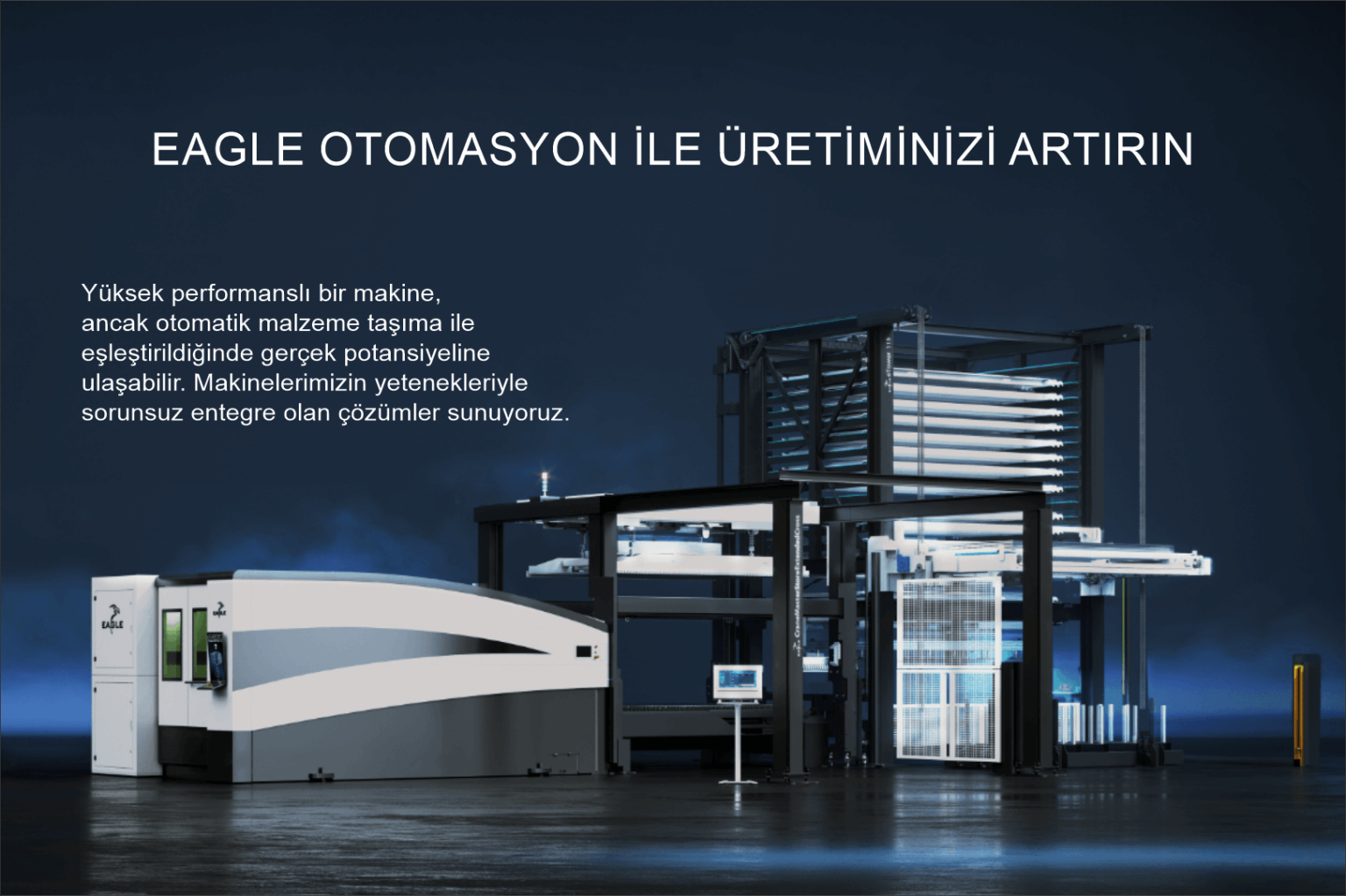 Tescilli otomasyon sistemlerimiz, makinelerimizin yeteneklerinden tam olarak yararlanmak için mükemmel uyum sağlar. Makinelerimizin kesebildiğini herşeyi otomasyonumuz taşıyabilir. Özünde çok yönlülük, modülerlik ve ergonomi bulunan Eagle otomatik malzeme taşıma çözümleri, işletmenizin ihtiyaçlarına mükemmel şekilde uyum sağlayarak zemin alanından en iyi şekilde faydalanabilir ve verimliliği bir sonraki seviyeye taşıyabilir.